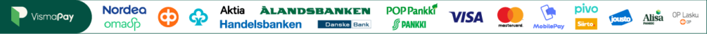 Visma Pay -palvelun kautta voit maksaa verkkopankkitunnuksilla, lompakolla, maksukorteilla (credit/debit), laskulla tai osamaksulla. Käytettävissä ovat seuraavat maksutavat: Osuuspankki, Nordea, Danske Bank, Oma Säästöpankki, Säästöpankki, Aktia, Paikallisosuuspankit, S-Pankki, Handelsbanken, Ålandsbanken, MobilePay, Pivo, Visa-, Visa Debit-, Visa Electron-, MasterCard- ja Debit MasterCard -kortit sekä Alisa Lasku.