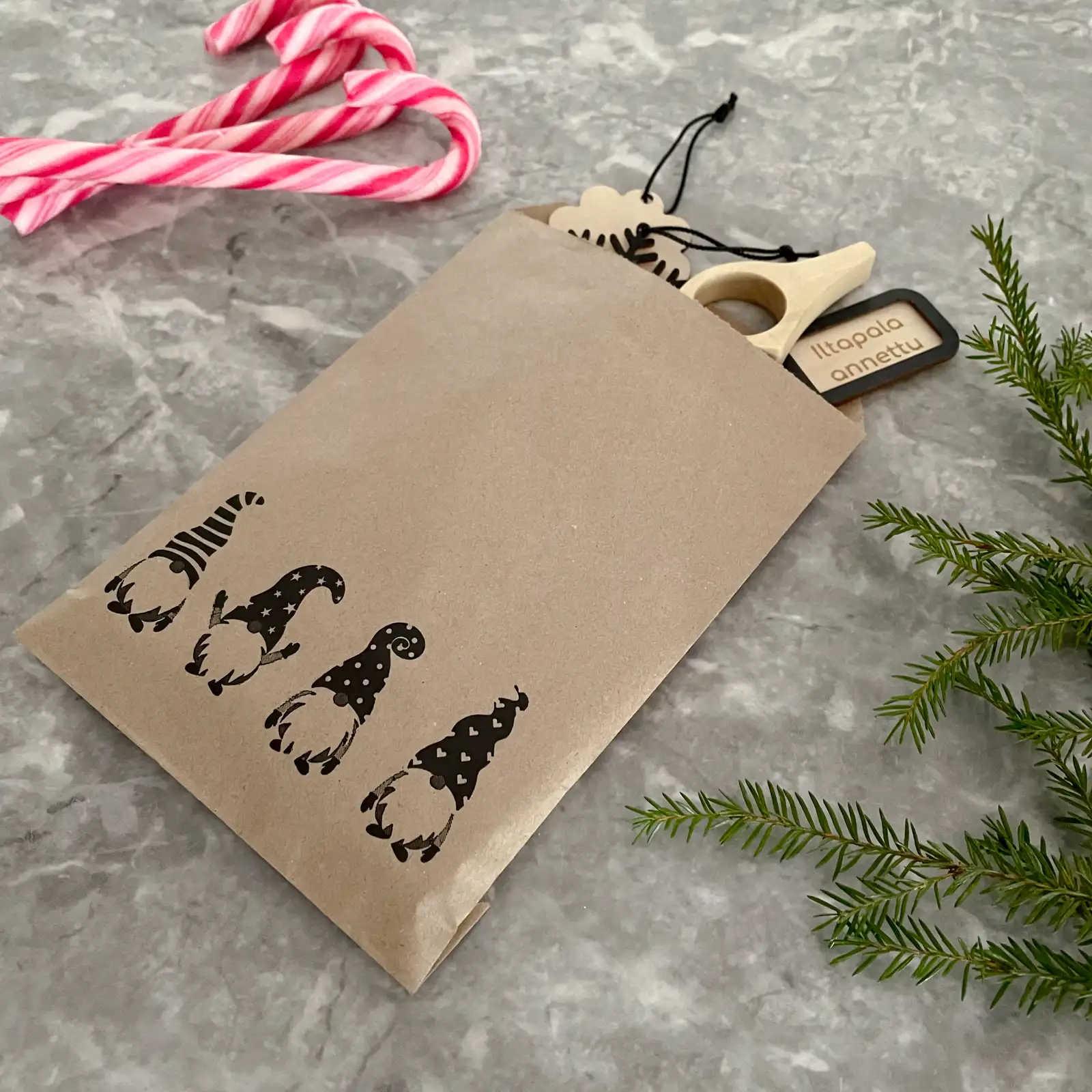 Pienille tuotteille sopiva lahjapussi, jossa ”hyvää joulua” tekstillä oleva pakettikortti. Hinta on 1€/kpl. Useammalle henkilölle lahjaa ostaessa, erittele kassan ”Tilauksen kommentit” kentässä mitkä tuotteet laitetaan mihin pussiin.