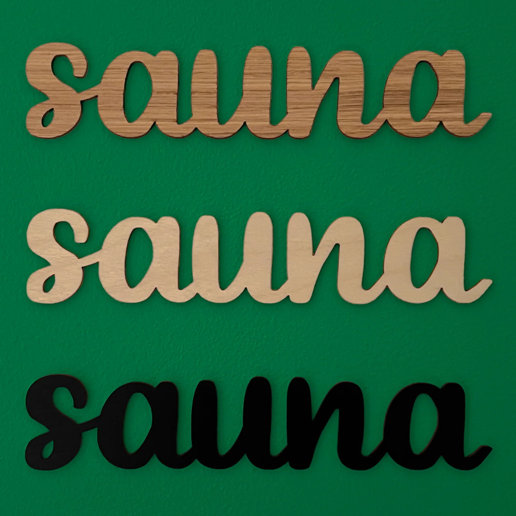 Tyylikäs Sauna-kyltti valmiiksi asennetulla tarrakiinnityksellä. Värivaihtoehtoina ovat koivu, musta, valkoinen, harmaa ja tammi. Reunat jäävät tumman ruskeiksi laser-leikkauksen jäljitä. Tammisen kyltin pinta on käsitelty puuöljyllä, kaikki muut lakattu. Sauna-kyltit on valmistettu Suomessa kotimaisesta koivuvanerista. Koko: 14cm x 3cm