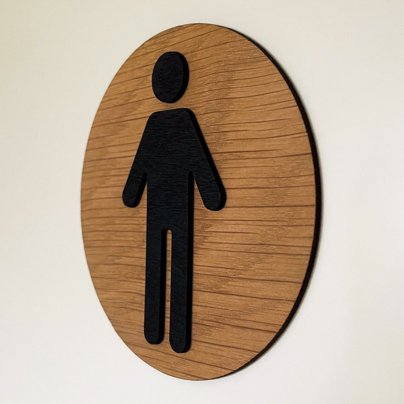 WC-kyltti opastamaan miesten vessaan. Pohja on valmistettu tammivanerista, joka on käsitelty kasviöljypohjaisella puuöljyllä. Päälle on liimattu mustaksi maalatusta koivuvanerista valmistettu miehen siluetti. Takana kaksipuoleinen teippikiinnitys. Valmistettu verstaallamme Keski-Suomessa, kotimaisesta tammi- ja koivuvanerista. Puun kuviointi ja sävy vaihtelee hieman tuotteittain. Kyltin koko on 9,5cm x 9,5cm
